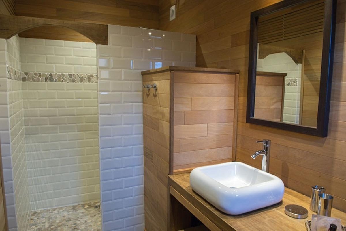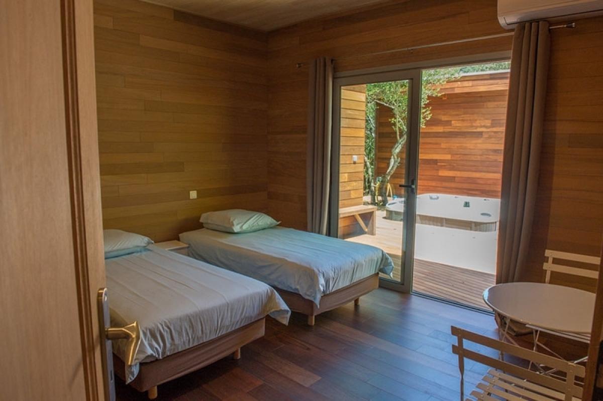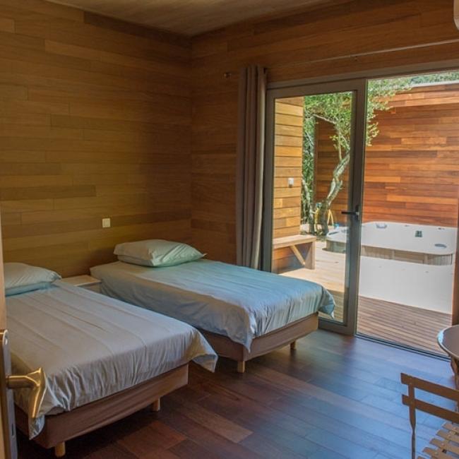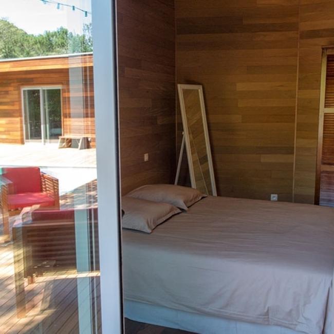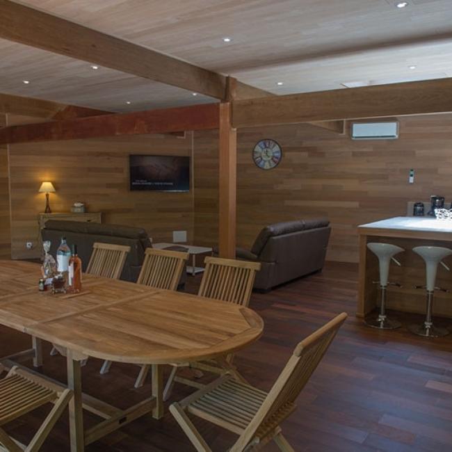 Deux canapés, une TV grand écran, une grande table à manger, une buanderie, deux chambres aux deux extrémités, s’ouvrant sur une grande terrasse en bois nous proposant deux autres chambres en extérieur.