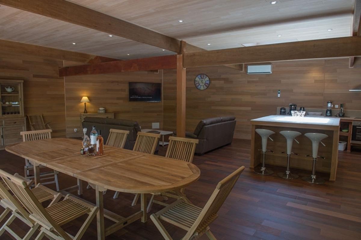 250 m² habitable : une grande pièce de vie, un coin cuisine aménagée avec large choix d’ustensiles de cuisine, un frigidaire / congélateur, petit frigo d’appoint pour les bouteilles et un ilot central.