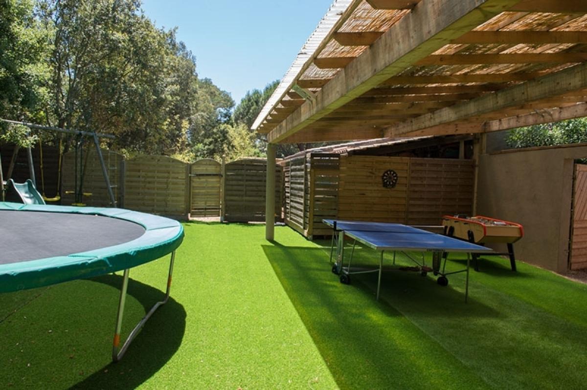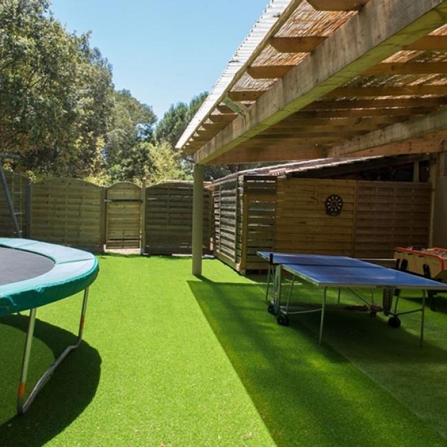 En extérieur : Une grande table ronde, transats, parasols et barbecue au charbon. Espace jeux extérieur : balançoire, toboggan et trampoline… sans oublier le célèbre baby-foot et sa table de ping-pong.